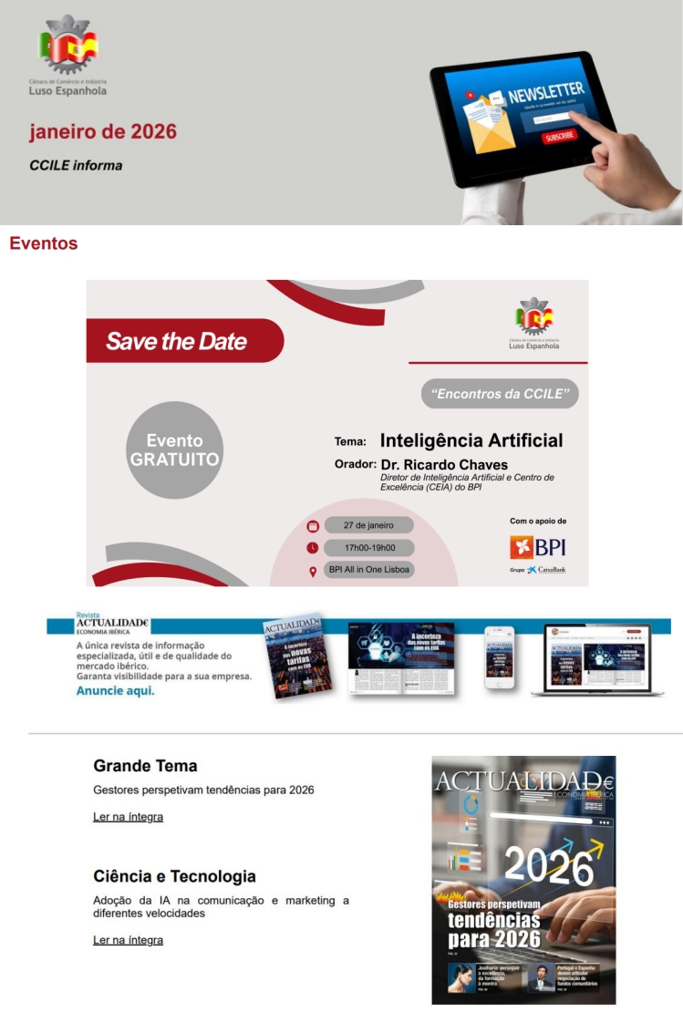 A revista Actualidad€ Economia Ibérica, com 30.000 leitores em Portugal e Espanha, é um excelente veículo de promoção. Leia a última edição e aceda às anteriores.