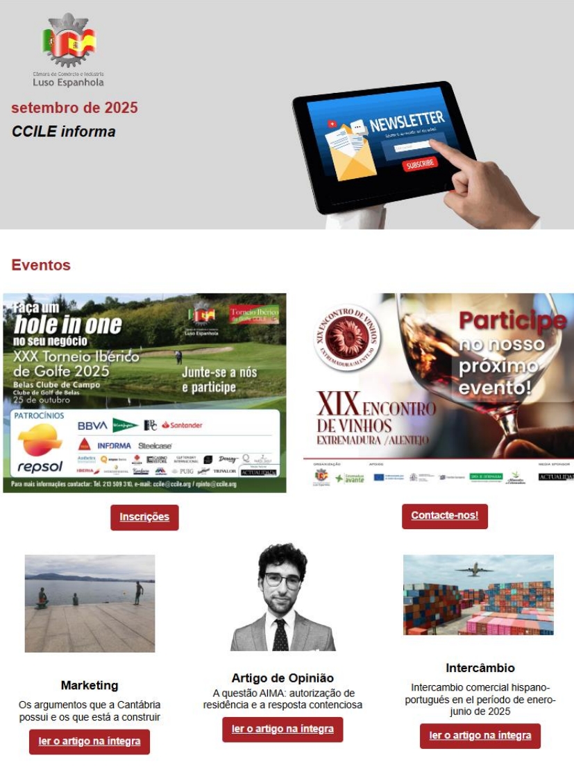 Todos os meses lançamos a nossa newsletter, que divulga eventos (almoços, torneios, seminários, conferências) e atividades formativas. Também pode consultar notícias dos associados.