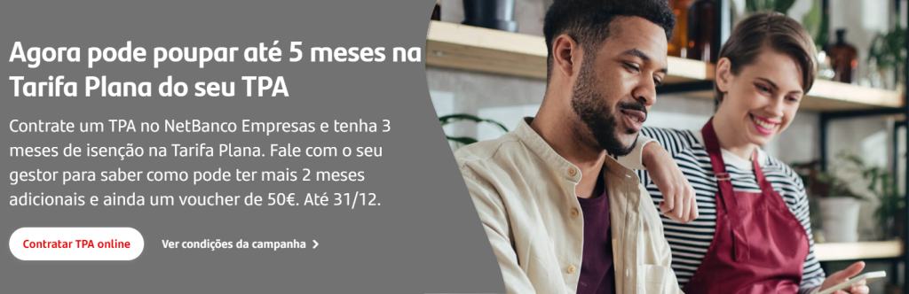 Até 31 de dezembro, contrate um TPA no NetBanco Empresas e tenha 3 meses de isenção na Tarifa Plana. Fale com o seu gestor e descubra como pode ter mais 2 meses adicionais de isenção e ainda receber um voucher de 50€.